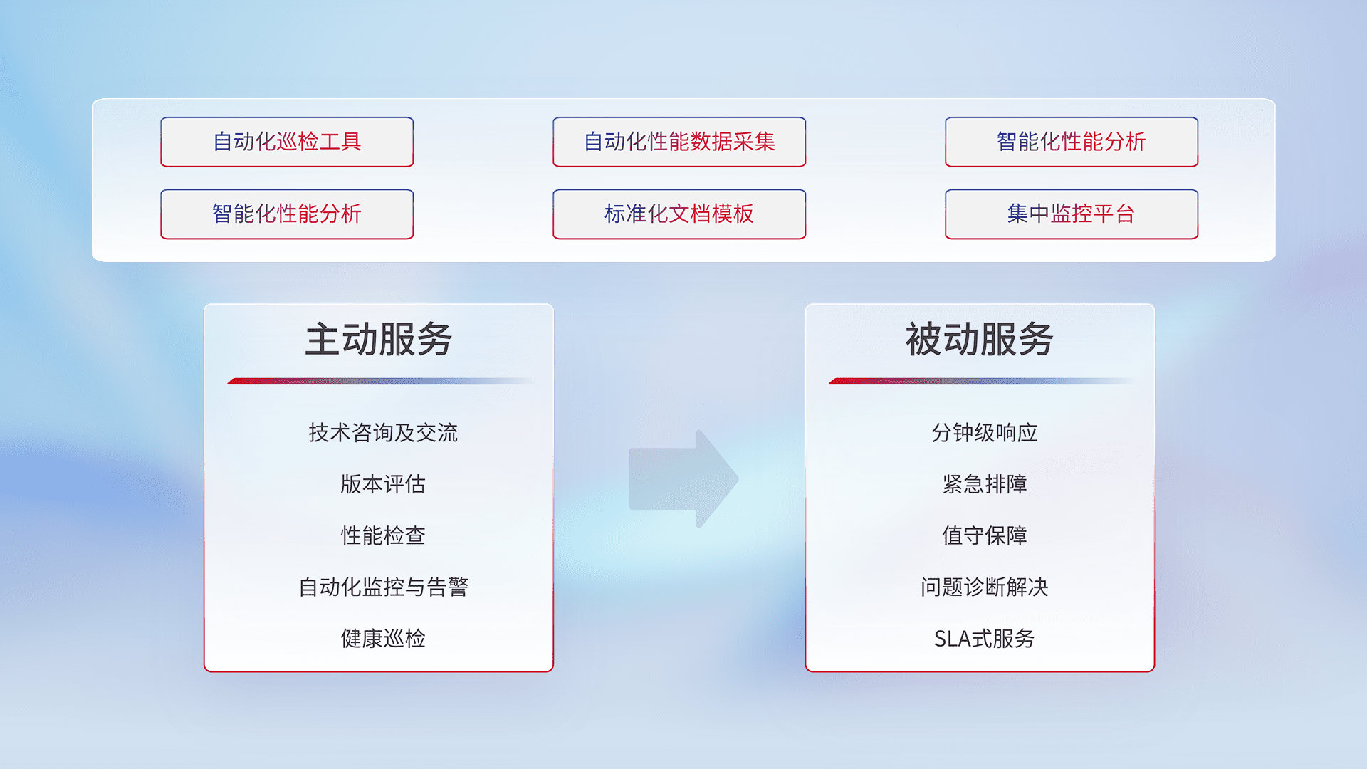 智能化工具和标准化文档,,,,保障服务质量,,,,提供主动服务(包含技术咨询、、版本评估、、、、性能检查、、自动化监控与告警、、、健康巡检)和被动服务包含(分钟级响应、、紧急排障、、、、值守保障、、、、问题诊断解决、、、SLA服务)。。。。